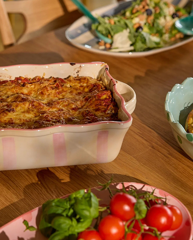 Prachtige, grote aardewerk ovenschaal. De mooie roze strepen en koraalkleurige randen zijn met de hand geschilderd door talentvolle ambachtslieden – dat betekent dat elke schaal uniek is! Als je keramiek koopt, moet je er rekening mee houden dat er na verloop van tijd kleine scheurtjes ontstaan, omdat het materiaal ‘leeft’ en altijd ‘werkt’.