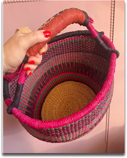 Prachtige hand gevlochten ronde mand met leren handvat!