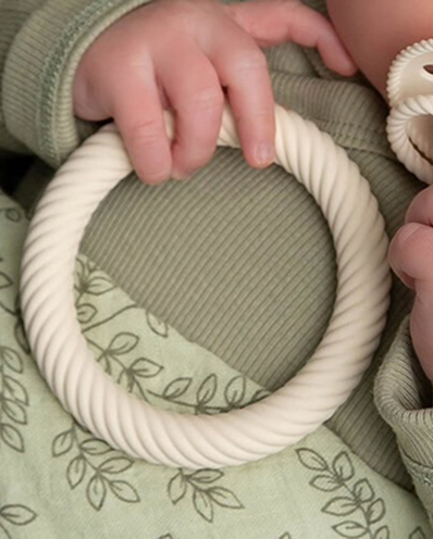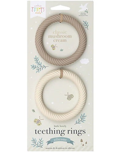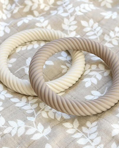 Taupe en crème set van twee siliconen bijtringen. Een bijtspeeltje is een welkome afleiding voor je baby tijdens het doorkomen van de melktandjes. Ontworpen met liefde en aandacht voor de allerkleinsten onder ons.