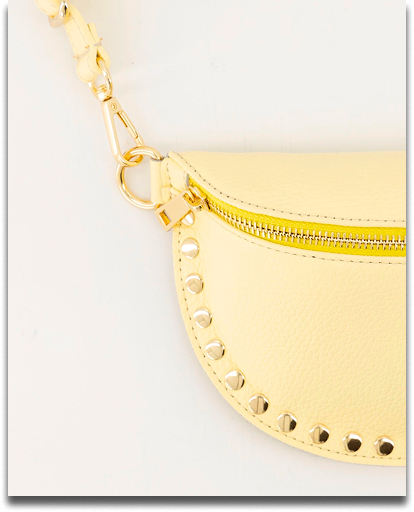 Hoogwaardig echt leren heuptas die ook als crossbody tas gedragen kan worden. De heuptas heeft een binnenvak en een steekvak met een afneembaar en verstelbaar leren hengsel. De tas is afgewerkt met studs en goudkleurige hardware.