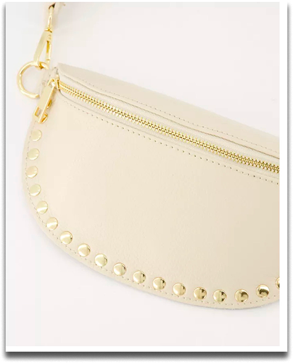 Hoogwaardig echt leren heuptas die ook als crossbody tas gedragen kan worden. De heuptas heeft een binnenvak en een steekvak met een afneembaar en verstelbaar leren hengsel. De tas is afgewerkt met studs en goudkleurige hardware.