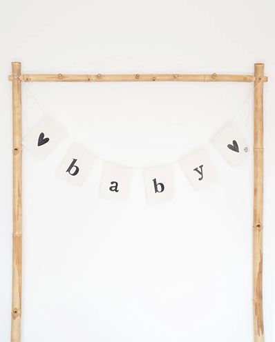 Deze vlaggenlijn van 200cm bestaat uit zes katoenen vlaggen met twee keer een hartje erop en letters die het woord baby vormen.